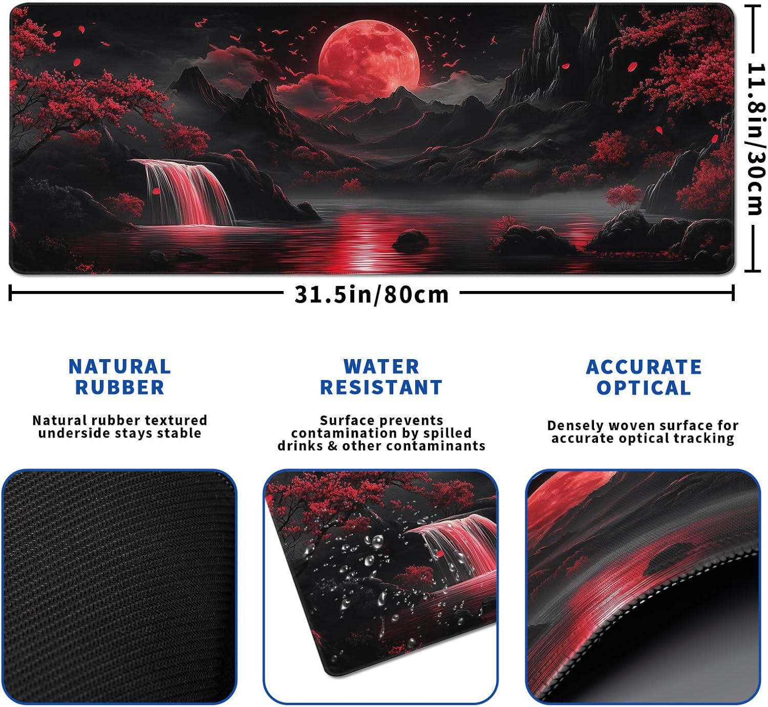 - ♥[Large and Perfect Size]:The extended Darkness Red Moon desk pad measures 31.5x11.8x0.12 inches that covers most of the desk.The desk pad is large enough to have a mouse, gaming keyboard, and other desk items while maintaining protecting your desk all the time.You can freely move your mouse without any interruption and don't have to continually adjust the mat as you do with traditional mousepads.