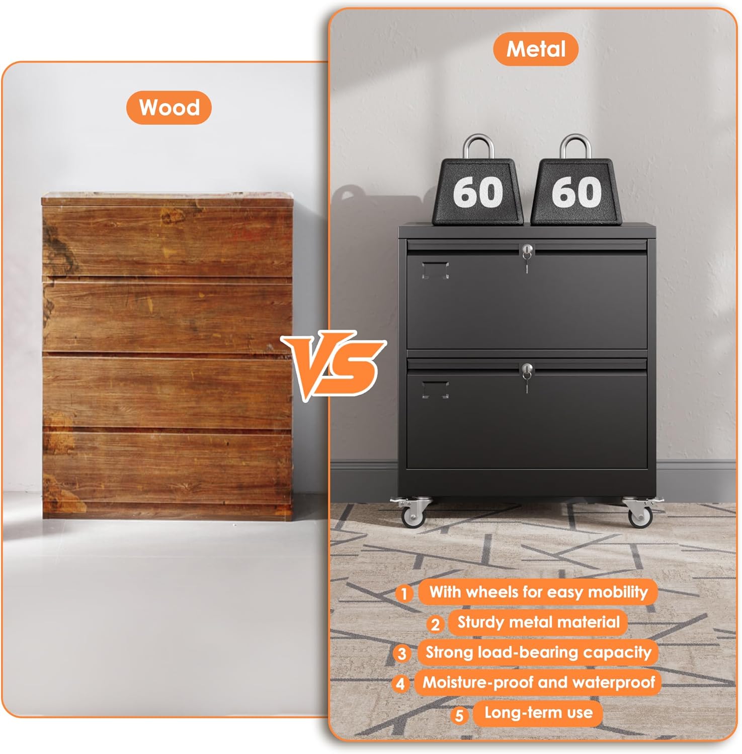 Aobabo Metal 2 Drawer Lateral File Mobile Cabinet with 2 Lock, Flie Cabinet with Wheels and Adjustable File Bars for Office,Home, for Letter/Legal Size, Black, Assembly Required