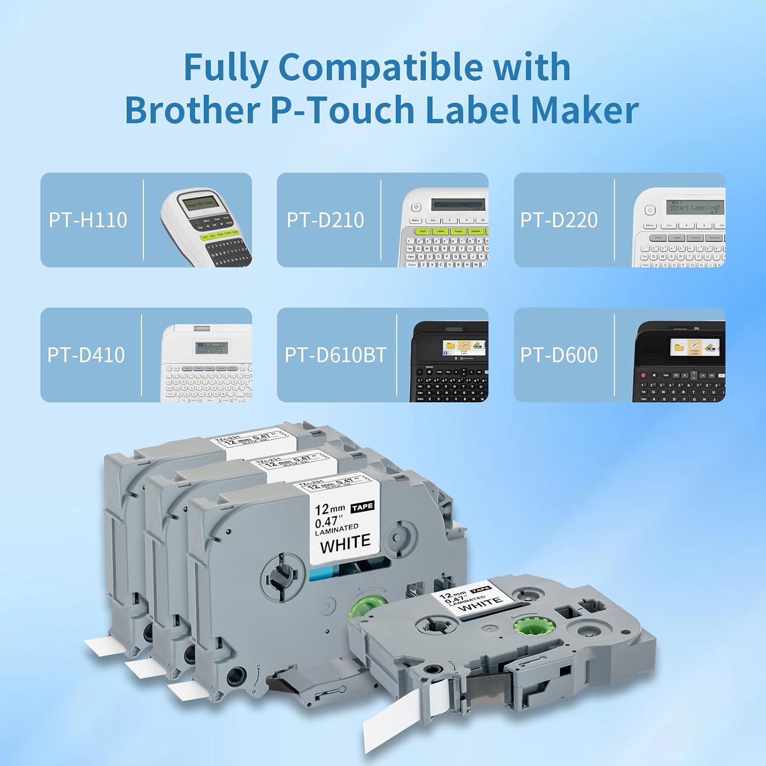 12mm 0.47 Laminated White Tape P Touch Compatible with Brother TZ-231 Tze231 TZ231 for P Touch D220, PTD210 PTH110, Tze TZ Tape 1/2Inch (4 Packs)