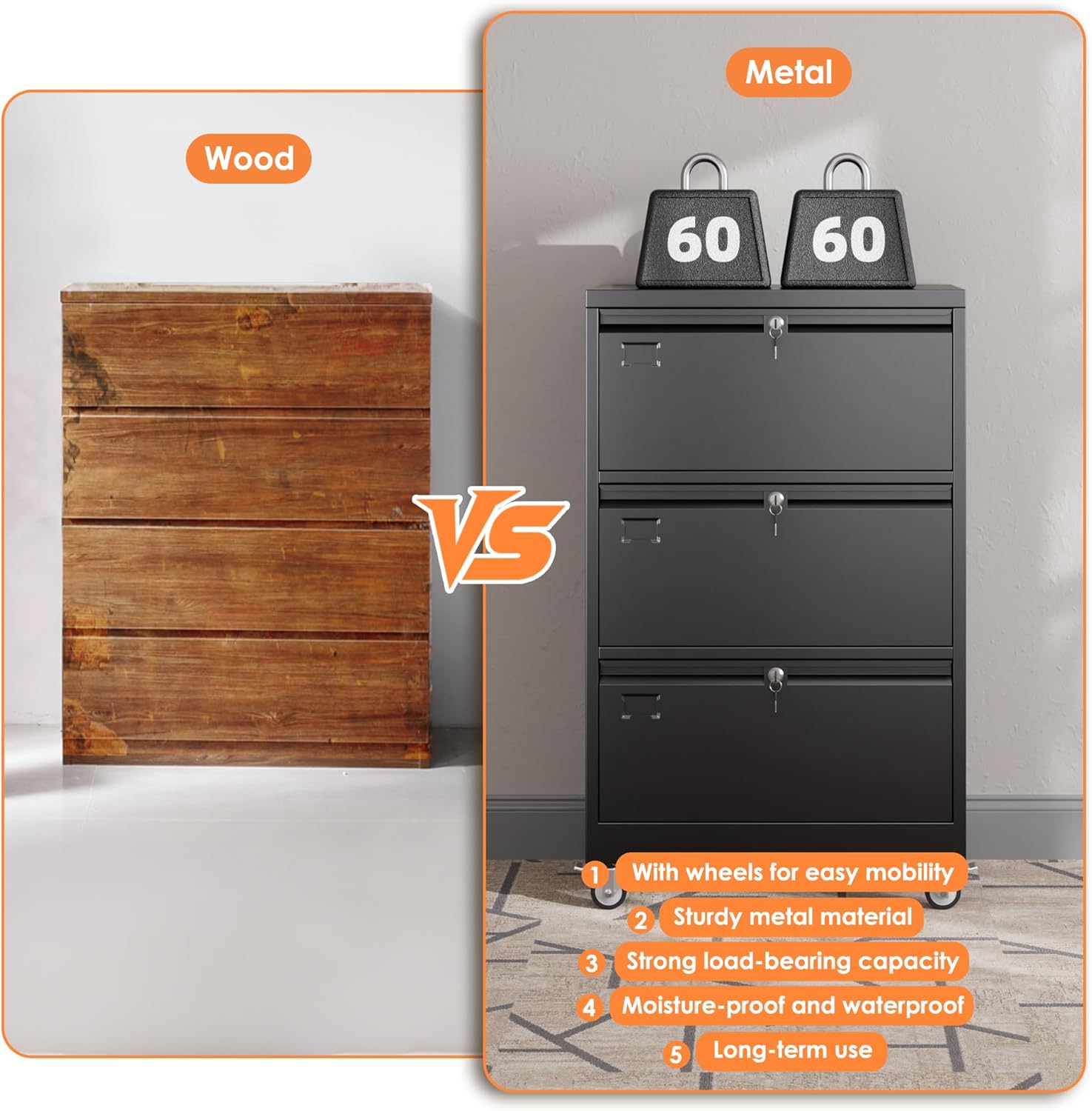 - ăLateral File Cabinet on WheelsăThe new design file cabinet with wheels is made of heavy duty steel material, and the surface with powder coating is very smooth, which can avoid rust. Due to their metal surface, metal storage cabinets are easy to clean and maintain.The wheels can be locked, placed fixedly or moved freely