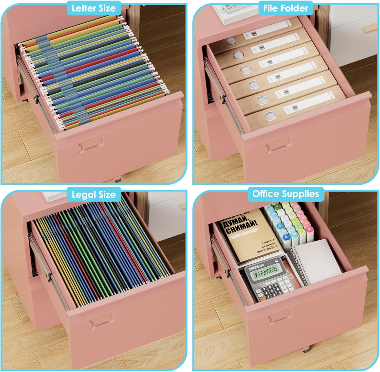 Aobabo 2 Drawer File Cabinet, Lockable Metal Filing Cabinet with Wheels for Home Office, Legal/Letter Size, Required Assembled,Pink