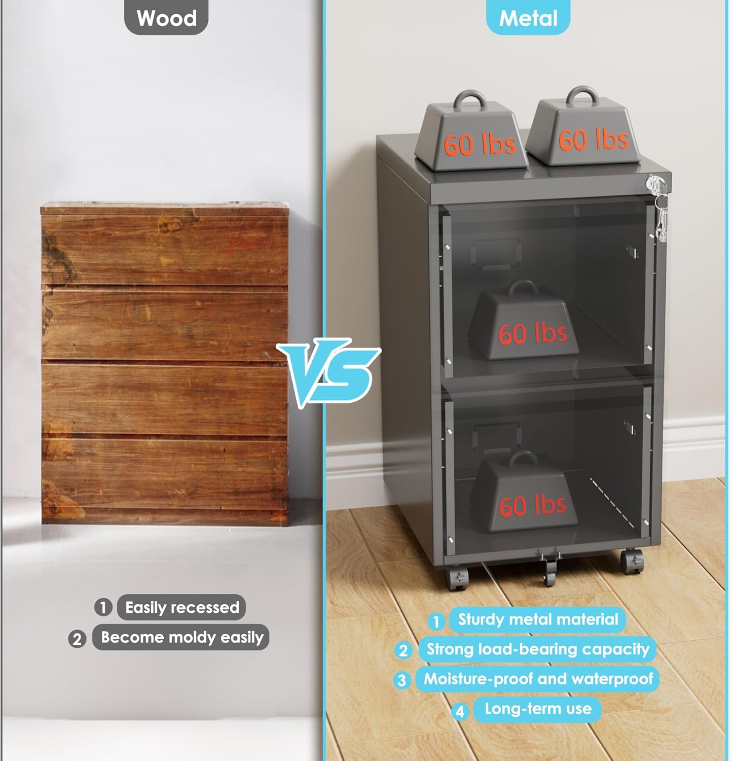 - ăAdd More Mobilityă:This mobile file cabinet arrives with five casters, including two front casters with braking function and one center caster to prevent tipping.