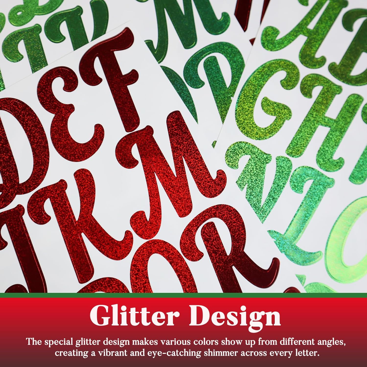 - Red and Green Letters: This set includes 10 sheets of glitter alphabet and symbol stickers, comprising 5 red-colored and 5 green-colored sheets, with each sheet containing one complete set of alphabets.