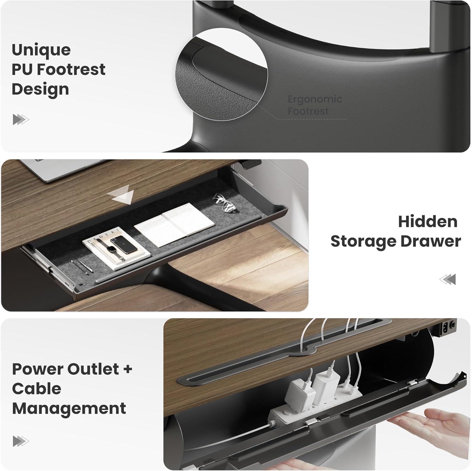 - Hidden Drawer & Organized Workspace: Unlike most standing desks, this one includes a large built-in drawer (25" wide) for easy storage of laptops, notebooks, and accessories. Combined with a rear cable tray + desktop grommet, it keeps your workstation clean, organized, and distraction-free.