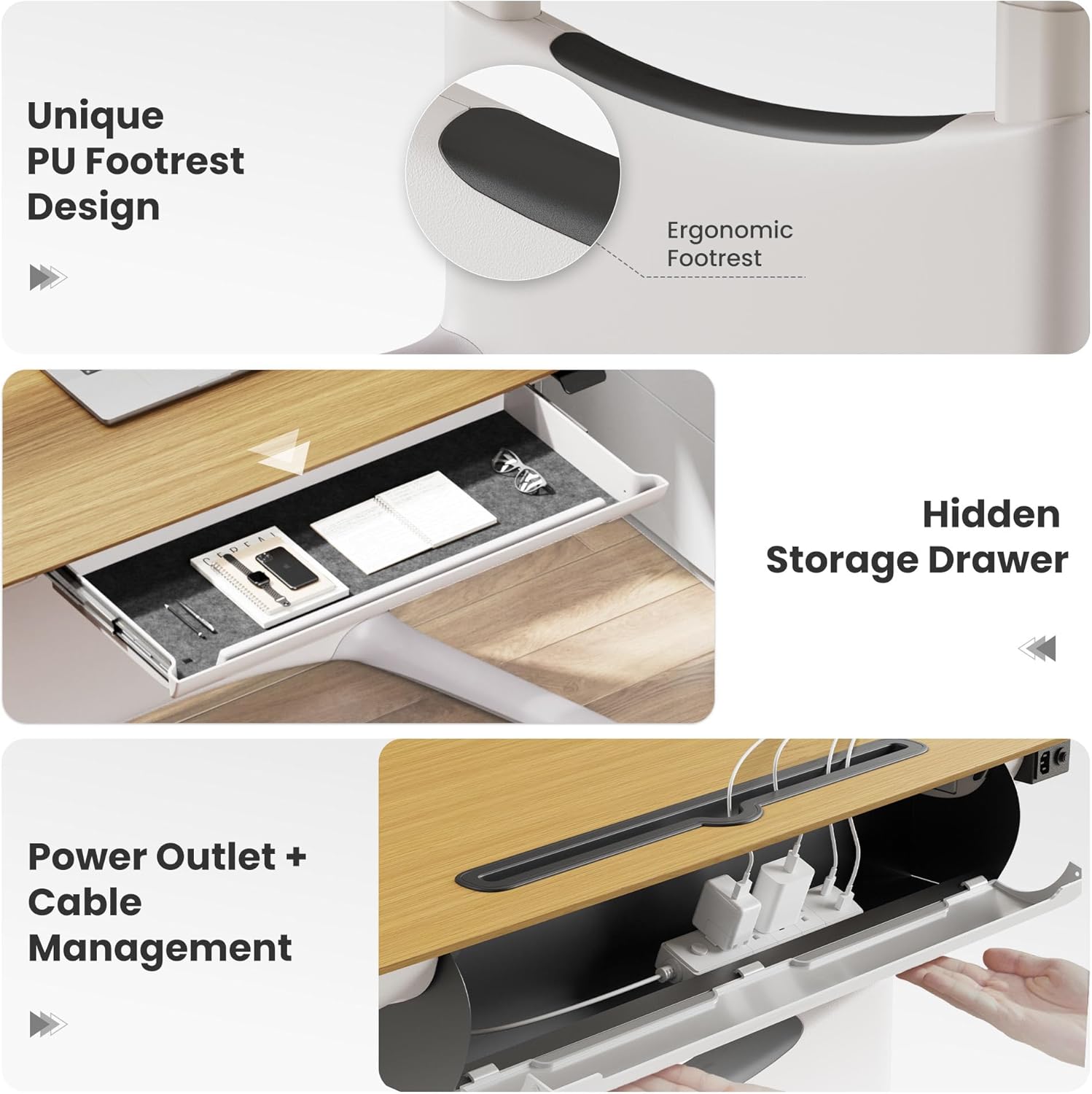 - Health-Focused Smart Features: More than just height adjustment—this desk includes a sit-stand reminder to encourage movement, an ergonomic footrest that supports cross-legged sitting or lounging, and an anti-collision system that halts instantly when obstacles are detected.